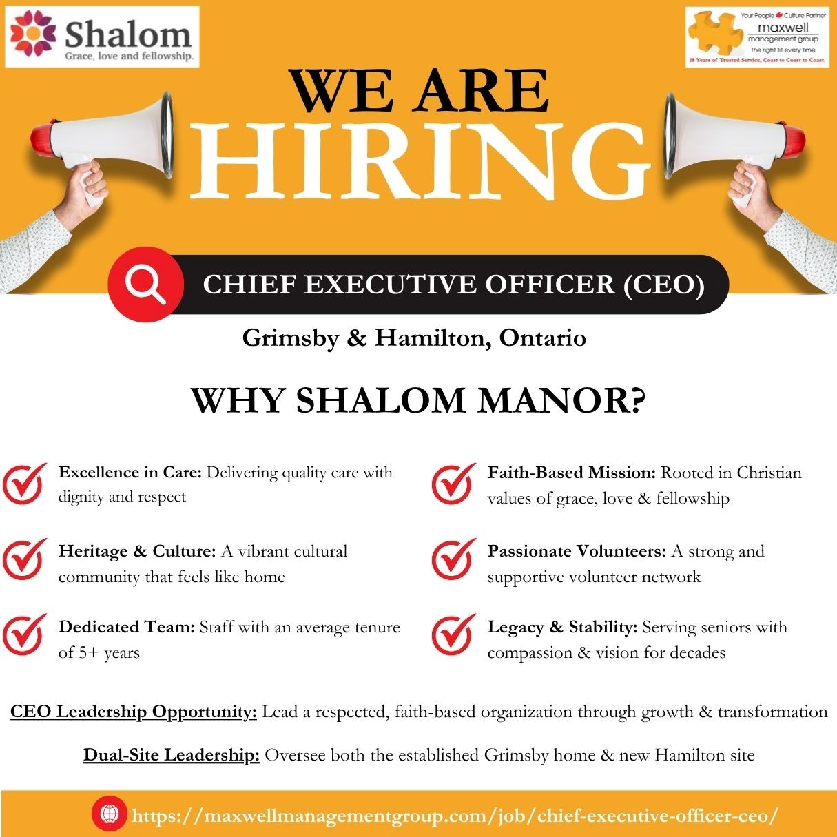 Shalom Manor is entering an exciting season of growth and renewal. With deep gratitude for the decades of compassionate, faith-centered care provided within the Dutch Reformed community, we are prayerfully seeking a Chief Executive Officer (CEO) to lead Shalom Manor into its next chapter. This role offers the opportunity to build upon a strong foundation in Grimsby while providing strategic leadership as we expand to a new campus in Hamilton. We are looking for a servant-hearted leader who shares our values and is committed to excellence in long-term care.
